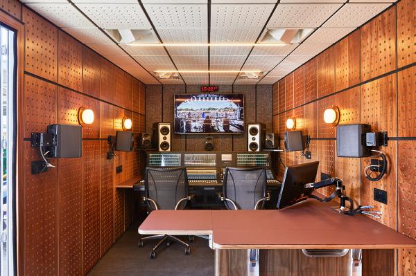 Grâce à l'intégration des systèmes réalisée par Megahertz et à la construction du camion assurée par Spectra, le Spiritland One est divisé en deux espaces : une salle de mixage à l'avant et une salle technique à l'arrière. Une attention particulière a également été portée à la création d'un environnement de travail confortable, depuis l'ergonomie des interfaces tactiles System T (« Incroyable », résume Shaw) jusqu'à la reproduction, dans l'ensemble du camion, de l'esprit architectural du studio principal de Spiritland à Londres. Il a également été conçu en pensant tout particulièrement au travail audio immersif, en associant un Dolby DP590 et un ensemble de haut-parleurs Neumann 7.1.4 à la console System T, avec l’avantage supplémentaire que le système fonctionne bien pour produire le mixage binaural que de plus en plus de festivals exigent.