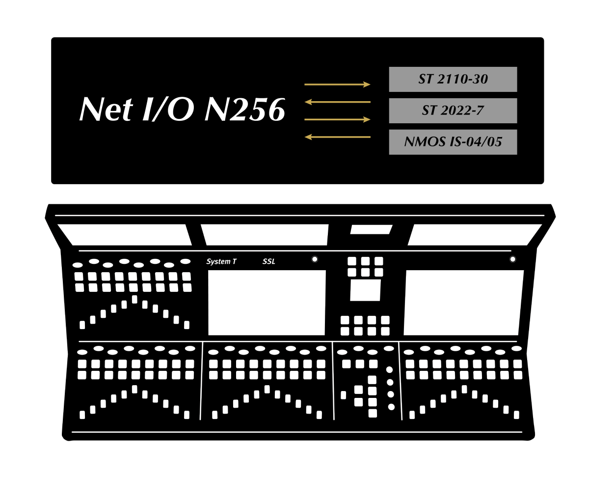 Le Net I/O N256 est une interface à 256 canaux permettant de connecter le System T à des réseaux ST 2110. Chaque N256 offre jusqu'à 128 flux ST 2110-30 en émission (Tx) et 128 en réception (Rx), avec une prise en charge complète des flux ST 2110-30 de niveaux A, B et C, ainsi que de la redondance des flux ST 2022-7. Les fonctionnalités NMOS IS-04 et IS-05 sont incluses pour la découverte et la gestion des connexions ; l'application SSL Connect (accessible via un navigateur Web) peut également être utilisée pour la configuration centralisée des flux, le contrôle du routage et le mappage des canaux. La séparation réseau fournit un pare-feu entre la console et les réseaux ST 2110, simplifiant ainsi les exigences d'intégration. Le N256 intègre une connectivité réseau redondante et une double alimentation électrique.