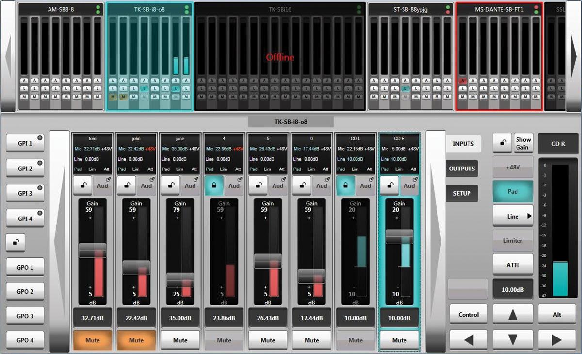 L'application « Network I/O Controller » de SSL permet de contrôler à distance l'ensemble des interfaces réseau I/O (micro, ligne et AES3) sur un réseau Dante. Le logiciel peut être installé sur n'importe quel PC connecté au réseau, et plusieurs instances du logiciel peuvent coexister sur le réseau ; toutes les instances de l'application ont accès à l'ensemble des interfaces SSL actuellement disponibles sur le réseau. L'application Controller offre un contrôle total sur l'ensemble des fonctionnalités des interfaces SSL et sert d'aide à la communication grâce à une indication claire et en temps réel de l'état des appareils et des canaux.