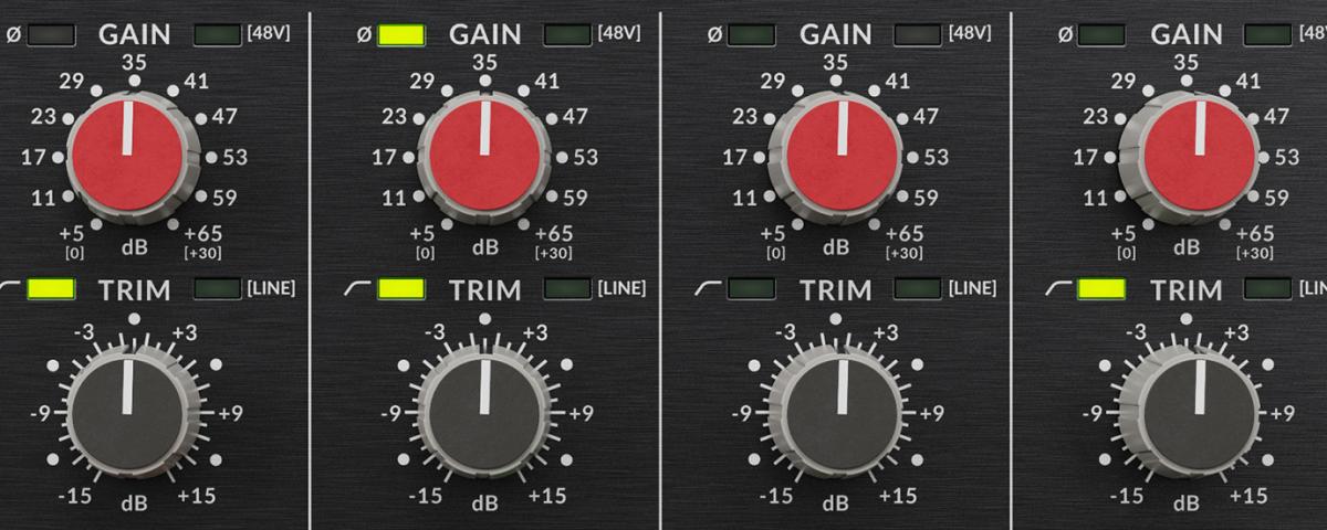 TRIM - Réglage de niveau à 31 crans, par paliers précis de 1 dB : saturer le signal à l'aide du potentiomètre Gain, puis ramener le niveau à un niveau approprié à l'aide du potentiomètre Trim.