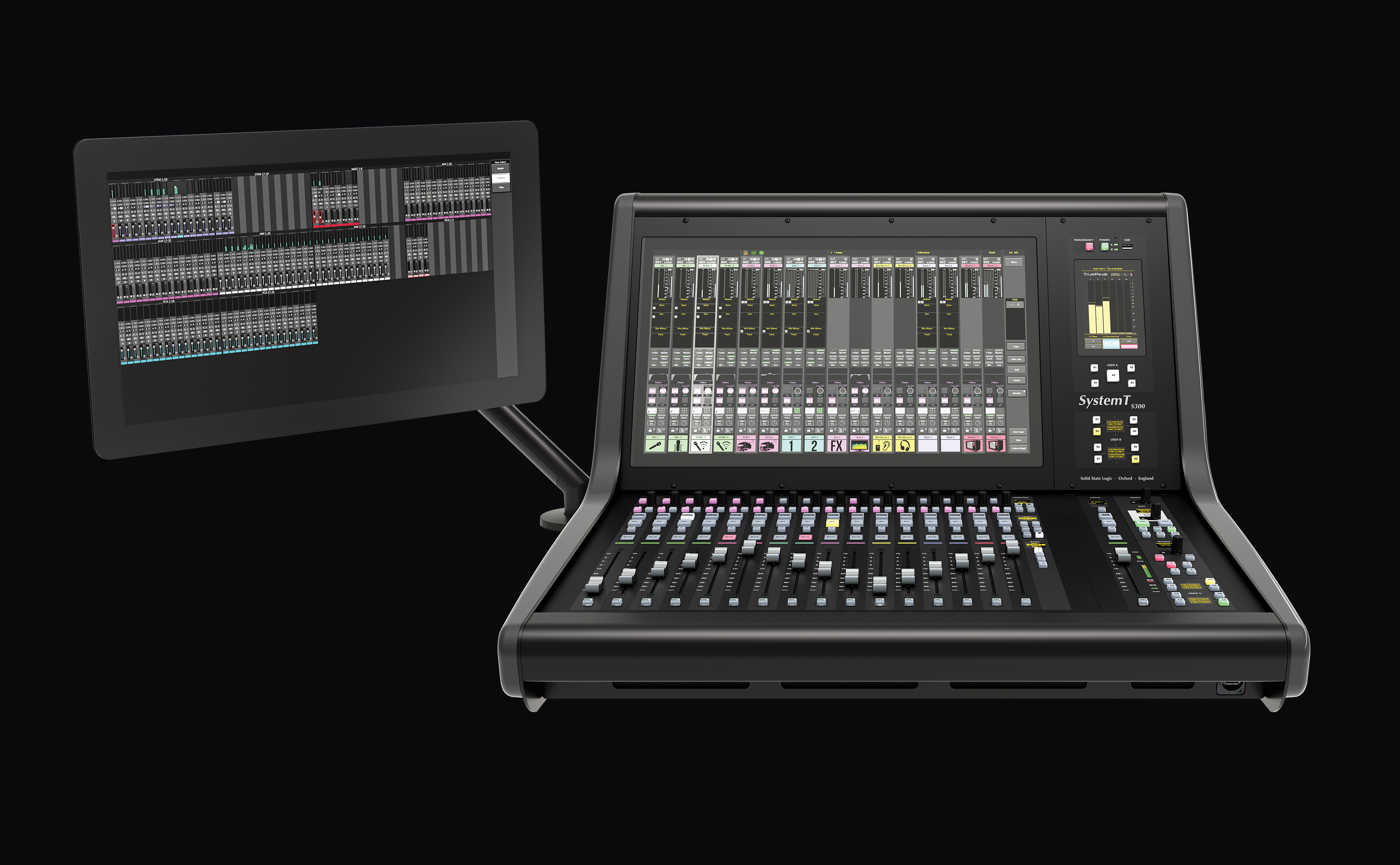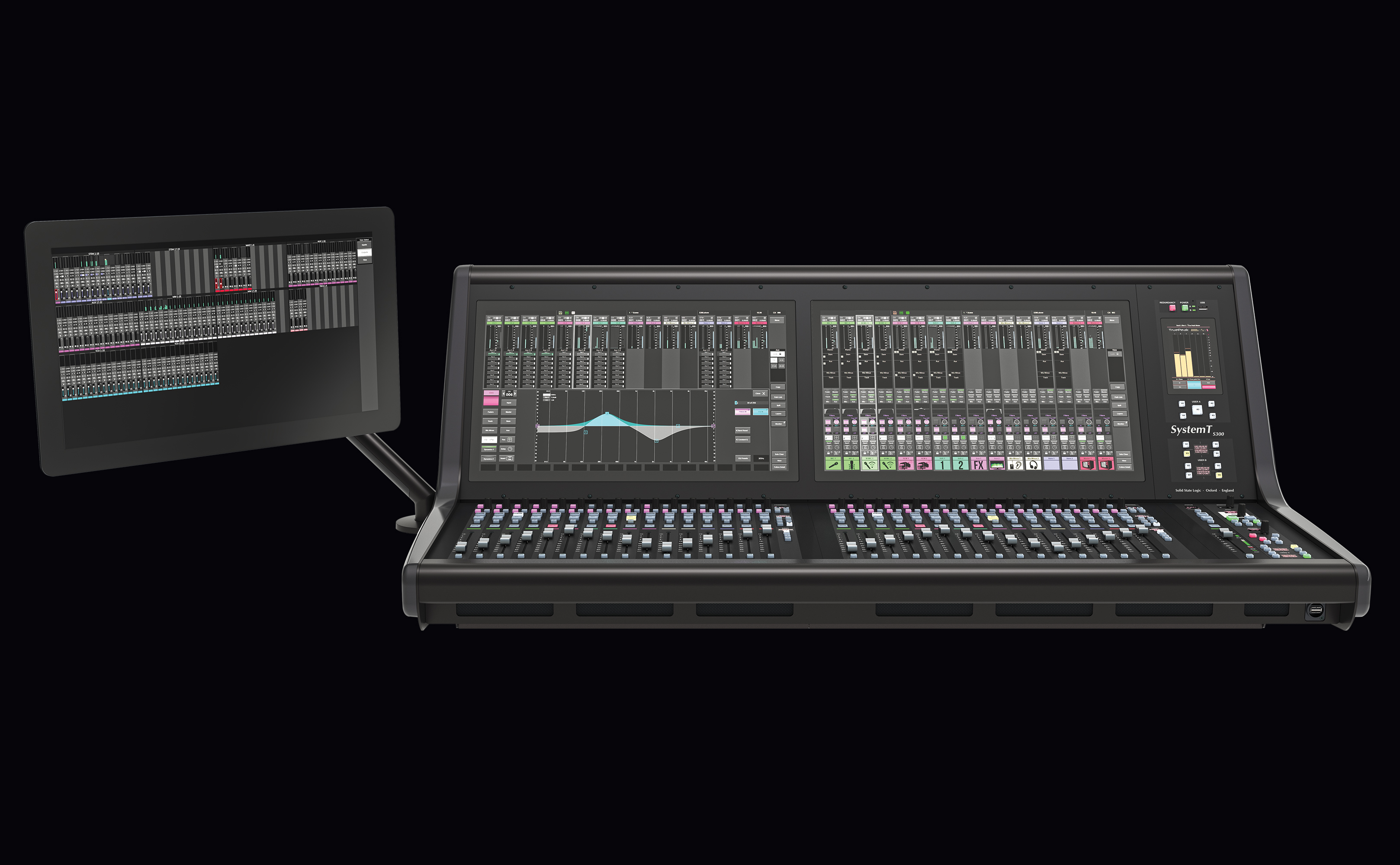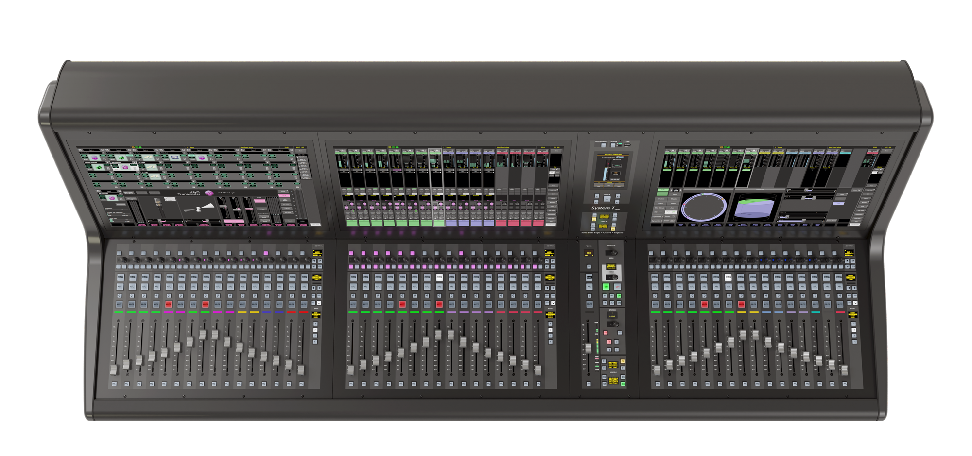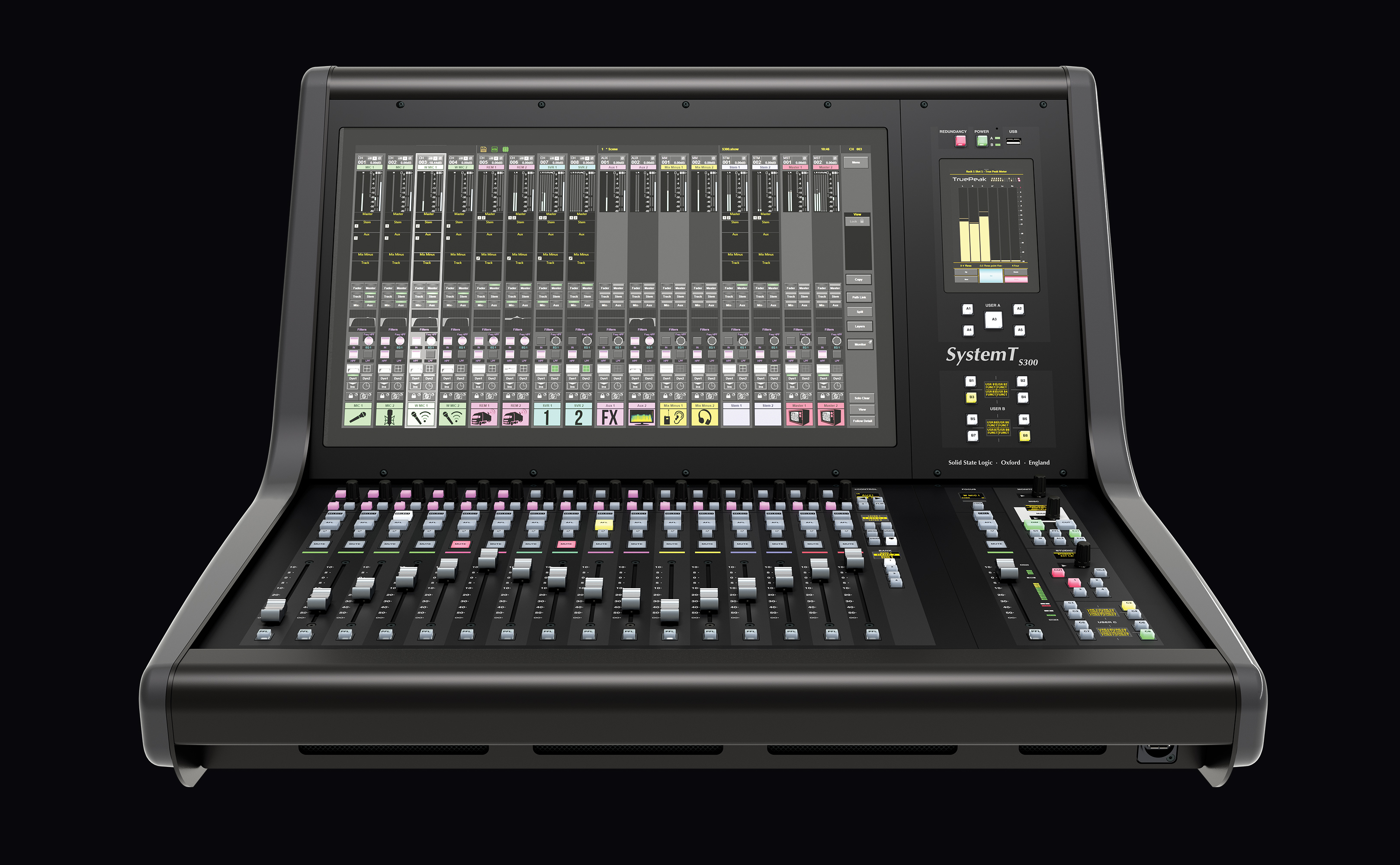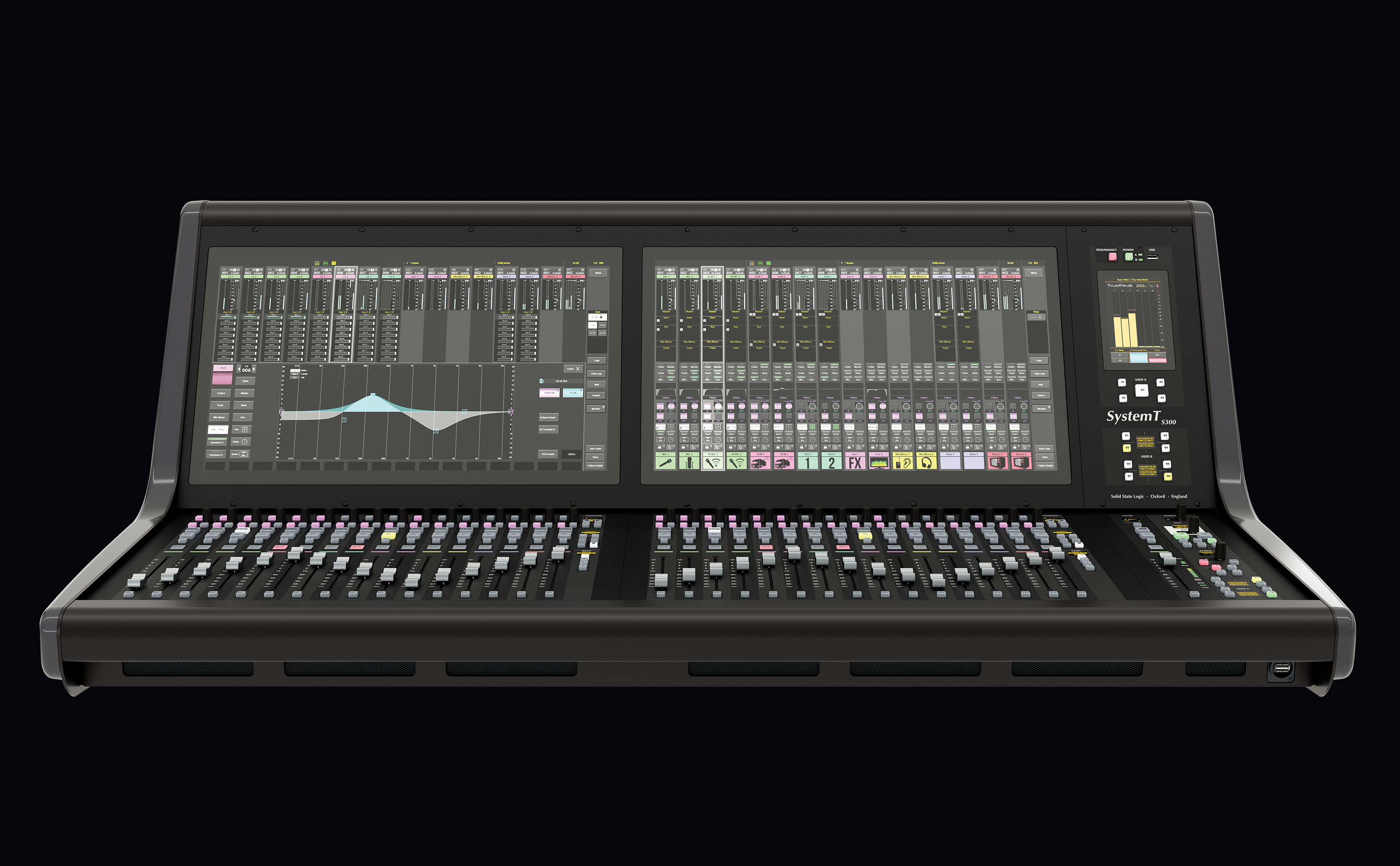 L'excellente interface graphique du System T s'associe à un matériel robuste et réactif. Le S300 Fader Tile dispose de quinze couches comprenant chacune quatre banques, offrant un accès rapide à 960 chemins via des boutons dédiés « Layer » et « Bank ». Chaque tranche de faders est équipée d'un fader motorisé de 100 mm, d'une touche PFL Solo et d'une fonction PFL par butée de fader. Des touches supplémentaires sont disponibles pour les fonctions Mute, AFL et Select, ainsi qu’une touche « Q » permettant d’accéder au système Super Q exclusif de SSL. Chaque bande dispose également d’un ensemble de commandes rapides (un encodeur à poussoir et trois touches assignables) qui fonctionnent en combinaison avec les éléments correspondants de l’interface à l’écran située au-dessus. Des LED de signalisation de couleur indiquent visuellement les fonctions sélectionnées.