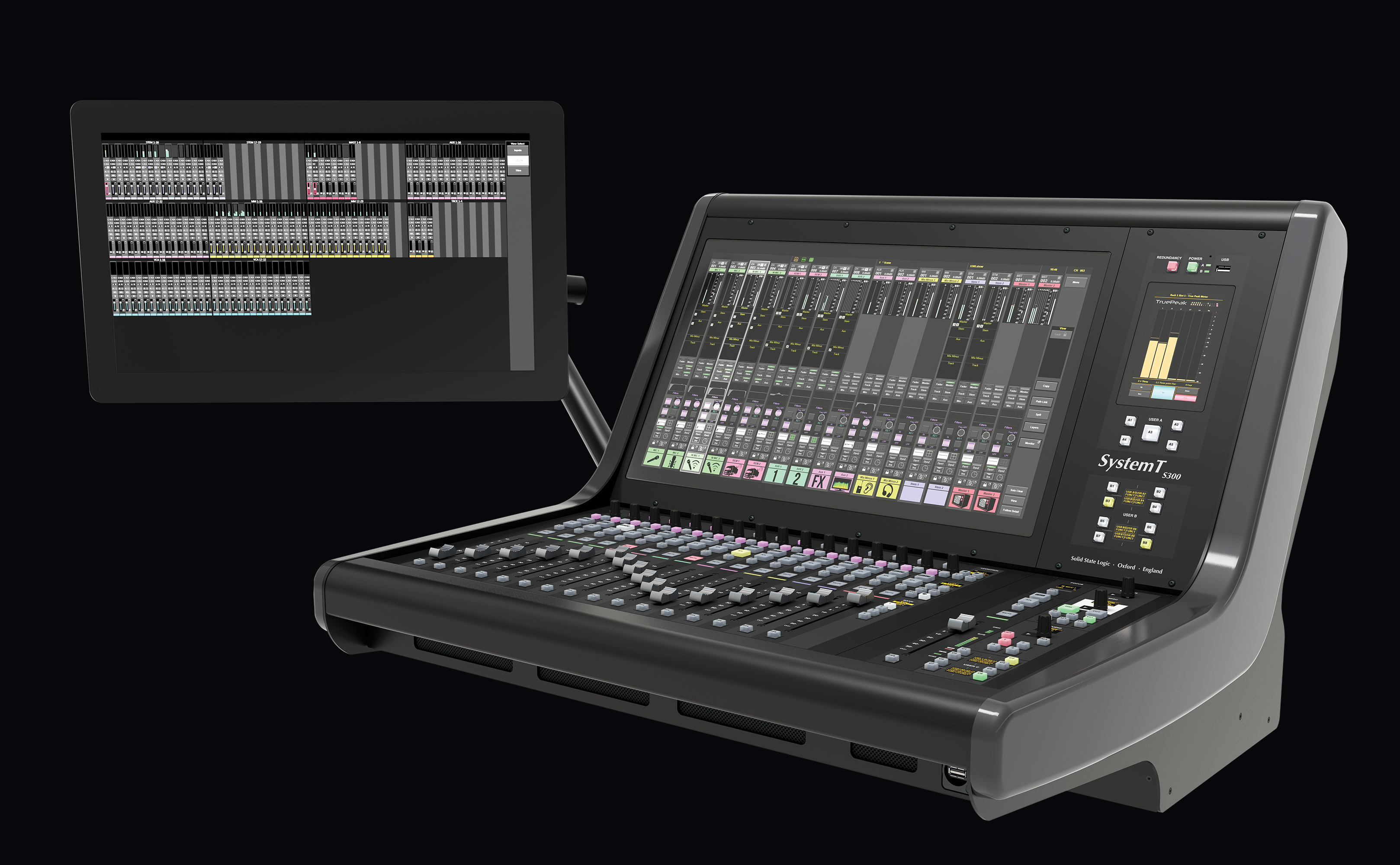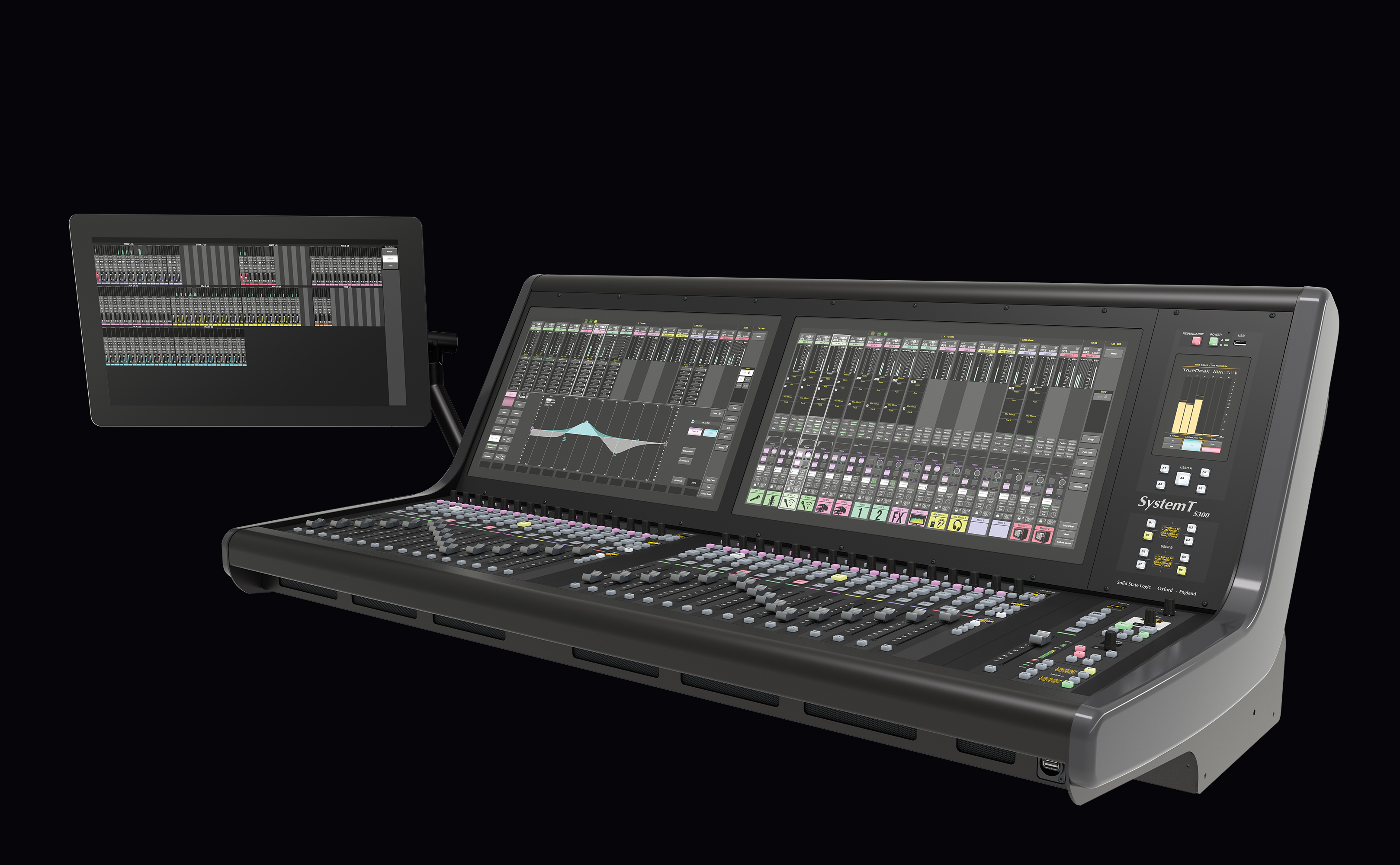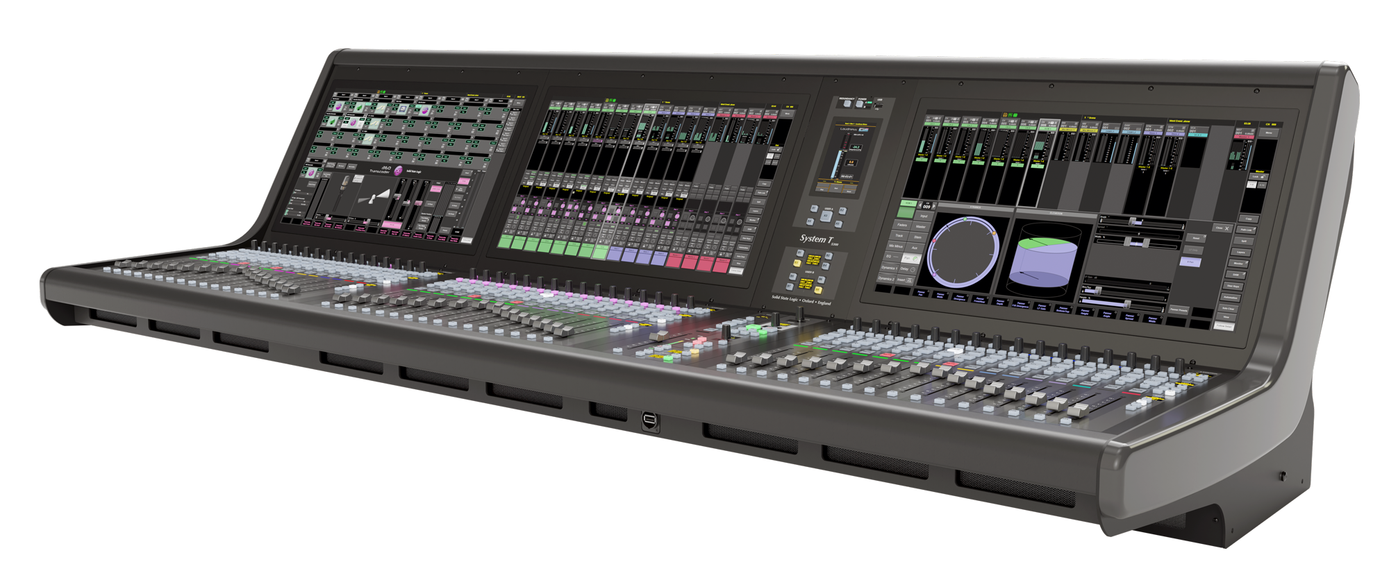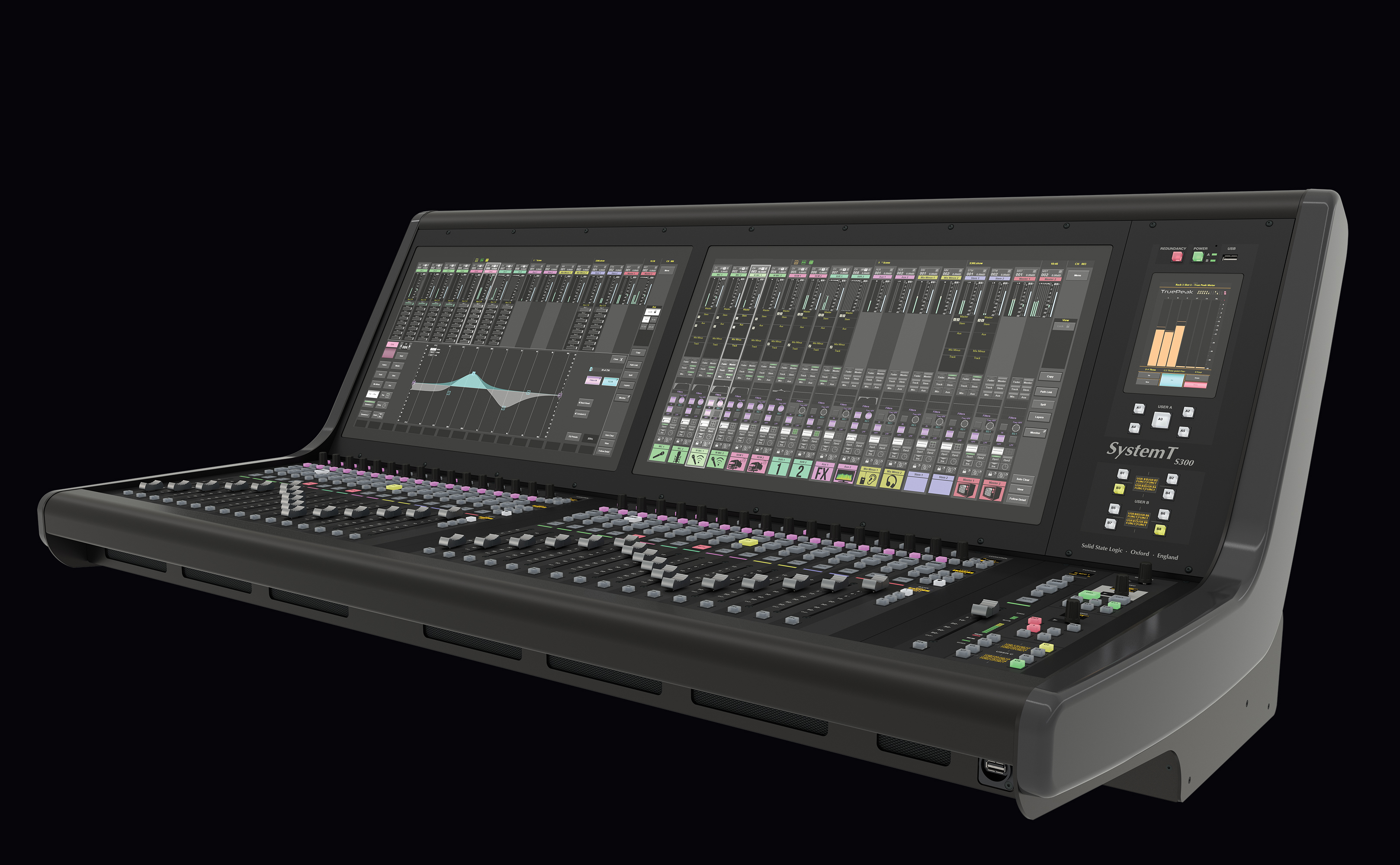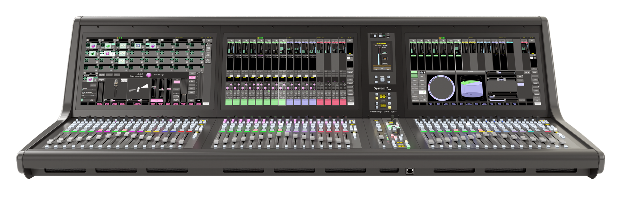 L'excellente interface graphique du System T s'associe à un matériel robuste et réactif. Le S300 Fader Tile dispose de quinze couches comprenant chacune quatre banques, offrant un accès rapide à 960 chemins via des boutons dédiés « Layer » et « Bank ». Chaque tranche de faders est équipée d'un fader motorisé de 100 mm, d'une touche PFL Solo et d'une fonction PFL par butée de fader. Des touches supplémentaires sont disponibles pour les fonctions Mute, AFL et Select, ainsi qu’une touche « Q » permettant d’accéder au système Super Q exclusif de SSL. Chaque bande dispose également d’un ensemble de commandes rapides (un encodeur à poussoir et trois touches assignables) qui fonctionnent en combinaison avec les éléments correspondants de l’interface à l’écran située au-dessus. Des LED de signalisation de couleur indiquent visuellement les fonctions sélectionnées.