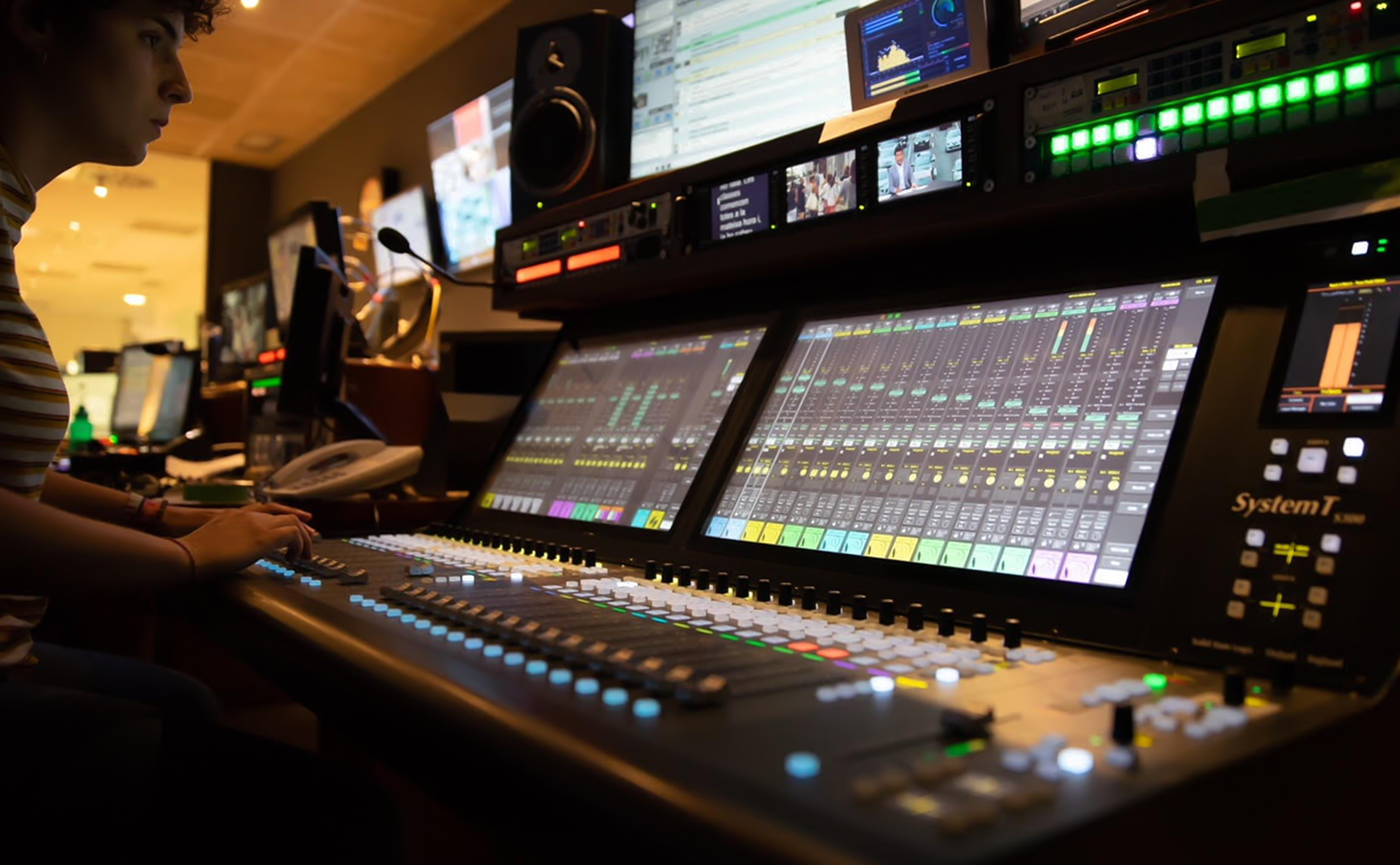 Le S300 est une console de commande compacte qui peut être associée à l'ensemble des options de commande, de traitement et d'E/S du System T de SSL. Il peut être intégré à une installation System T plus vaste ou utilisé en configuration autonome pour les petites installations de diffusion ou les cars régie.