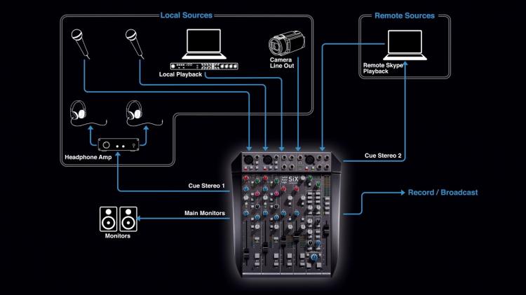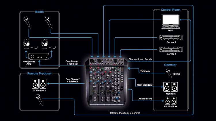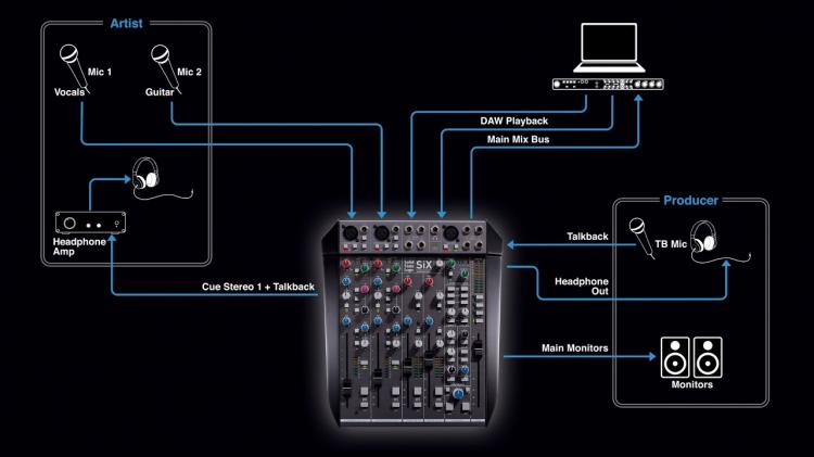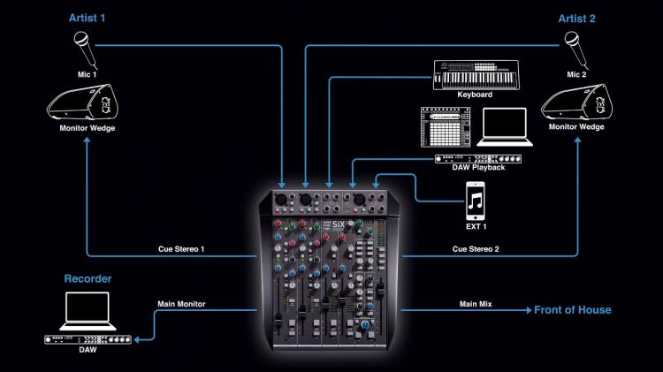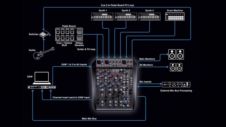 La SiX dispose de deux canaux mono équipés de préamplis micro SSL SuperAnalogue™ ; ceux-ci offrent un son transparent, une réponse rapide et une plage de gain bien plus étendue que ce que l'on trouve généralement sur une console de mixage de bureau compacte – 66 dB de gain, contre les 40 à 50 dB habituels sur ce type d'appareils. Ils sont équipés d'une alimentation fantôme, d'un filtre passe-haut à 75 Hz et d'une entrée de niveau ligne indépendante pouvant être commutée en entrée de niveau instrument à haute impédance.