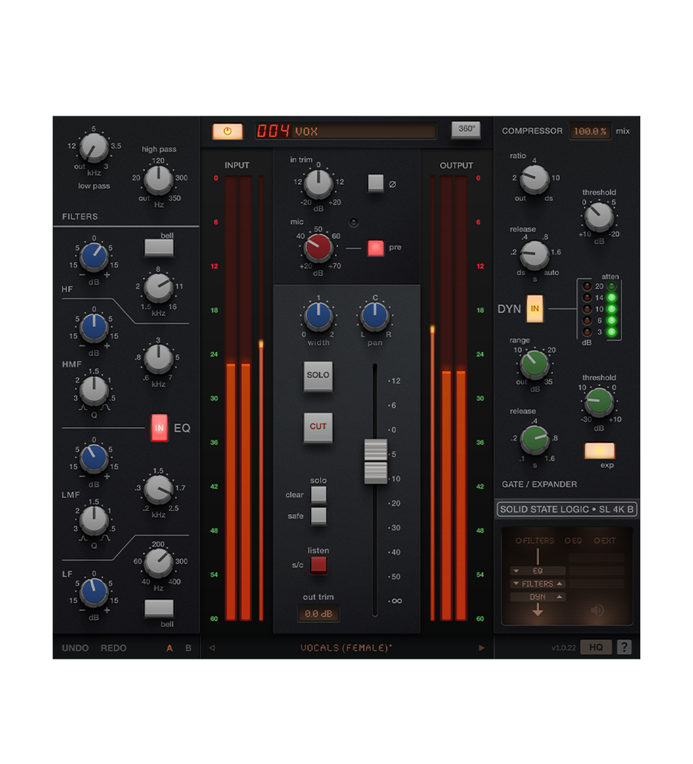 4K B : Riche en nuances, en puissance et doté d’un caractère analogique non linéaire, le 4K B est une émulation fidèle de la légendaire tranche de console B de la SL 4000. Le son emblématique de la console SL 4000 B est indissociable des enregistrements réalisés au célèbre Townhouse Studio 2 de Londres, surnommé la « Stone Room », à la fin des années 70 et au début des années 80.
