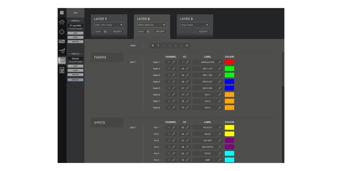 Les modèles UF8 et UF1 disposent d'une couche MIDI CC personnalisable permettant de contrôler des synthétiseurs, des bibliothèques d'échantillons et des unités de traitement externes telles que des synthétiseurs modulaires et des réverbérations.