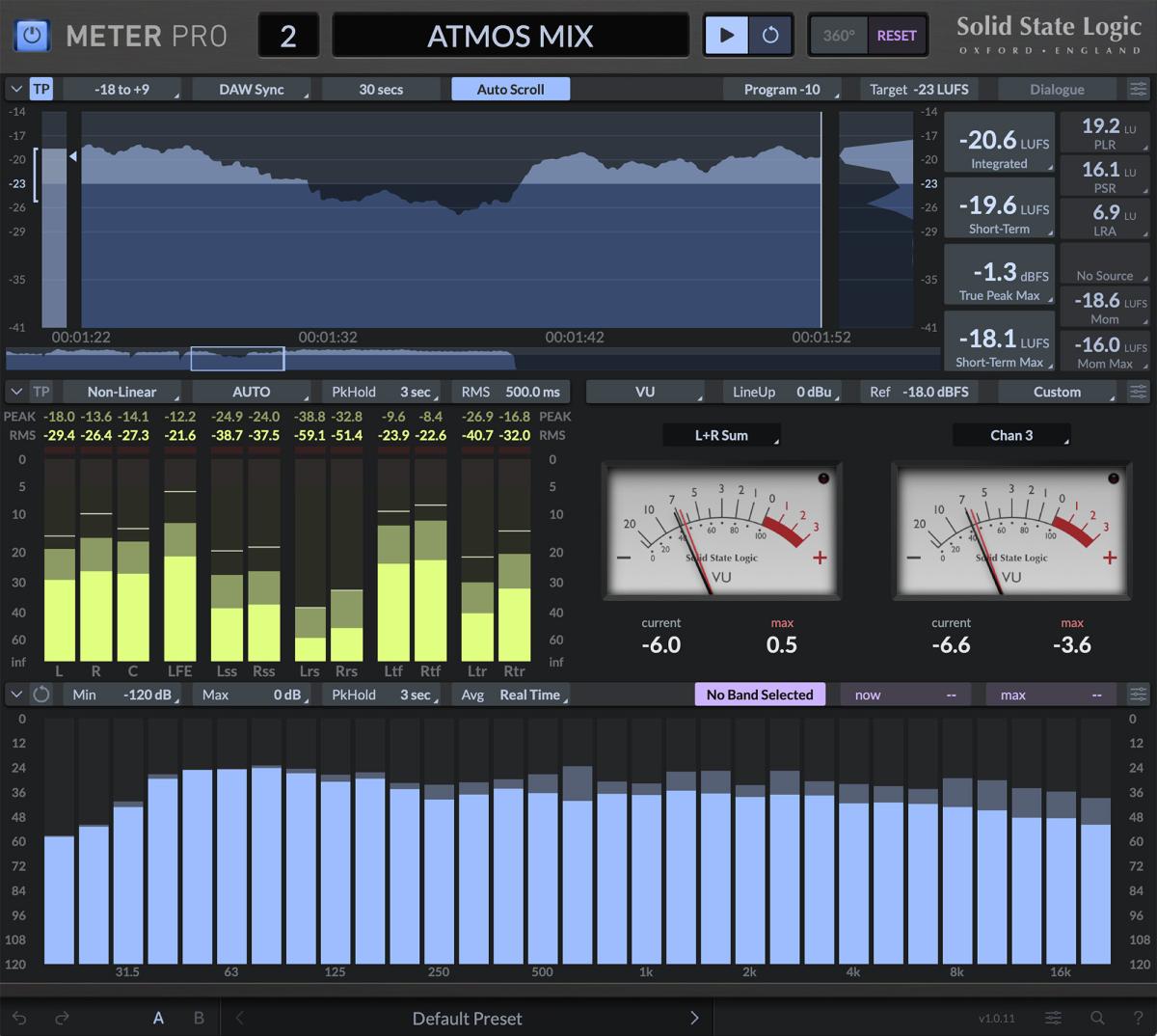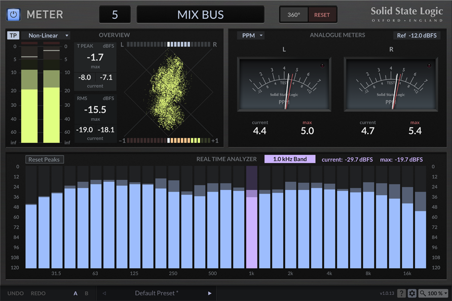 Une gamme indispensable d'outils de mesure soigneusement conçus pour relever les défis audio, garantir la cohérence et produire des mixages percutants. Grâce à ses mesures des niveaux de crête et RMS, de la cohérence de phase, de l'équilibre stéréo et de la réponse en fréquence, SSL Meter vous fournit les données nécessaires pour réaliser des mixages de grande qualité avec efficacité et précision.