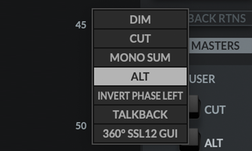 Les trois commutateurs du panneau avant sont préréglés sur les fonctions CUT pour les moniteurs, commutation des enceintes ALT et activation/désactivation du micro TALKBACK, mais vous pouvez choisir de leur attribuer l'une des fonctions suivantes en fonction de vos besoins : DIM, CUT, MONO SUM, ALT, INVERT PHASE LEFT, TALKBACK.