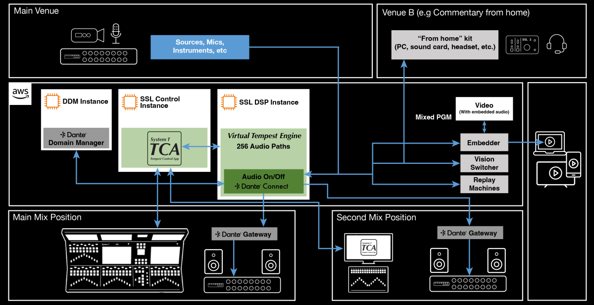 Les sources sont capturées sur le site principal à l'aide d'une interface réseau SSL et d'une petite interface sur le site B. Les deux flux sont envoyés au moteur DSP Tempest virtualisé fonctionnant dans le cloud AWS. Le contrôle est assuré par une instance de l'application Tempest Control fonctionnant dans le cloud AWS. Le transport audio dans le cloud et le routage audio sont gérés via Dante Connect. L'intégration de contrôle Dante inégalée de System T gère le routage et le contrôle Dante au sein des fichiers de spectacle de la console. Le traitement cloud à faible latence est contrôlé à l'aide de n'importe quelle surface de contrôle System T ou instance TCA au poste de mixage principal, avec d'autres postes de contrôle indépendants disponibles, comme illustré par une application Tempest Control avec Fader Tile à un deuxième poste de mixage.